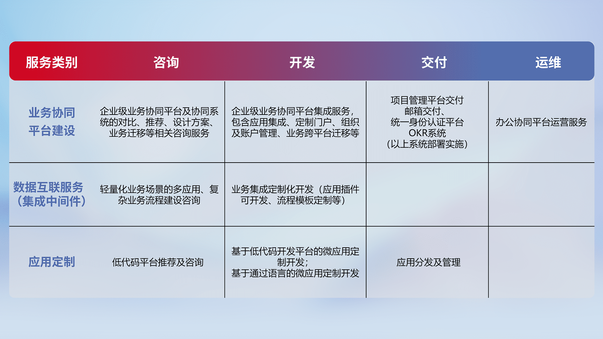 针对钉钉、、、、企微、、IDaas等平台级产品提供产品的规划、、、、方案、、、、交付、、、、定制化开发等服务,,,实现如统一协同办公、、智能客户服务、、、混合会议管理、、、、智能数据查询、、、等业务场景,,,,实现数字化转型。。。