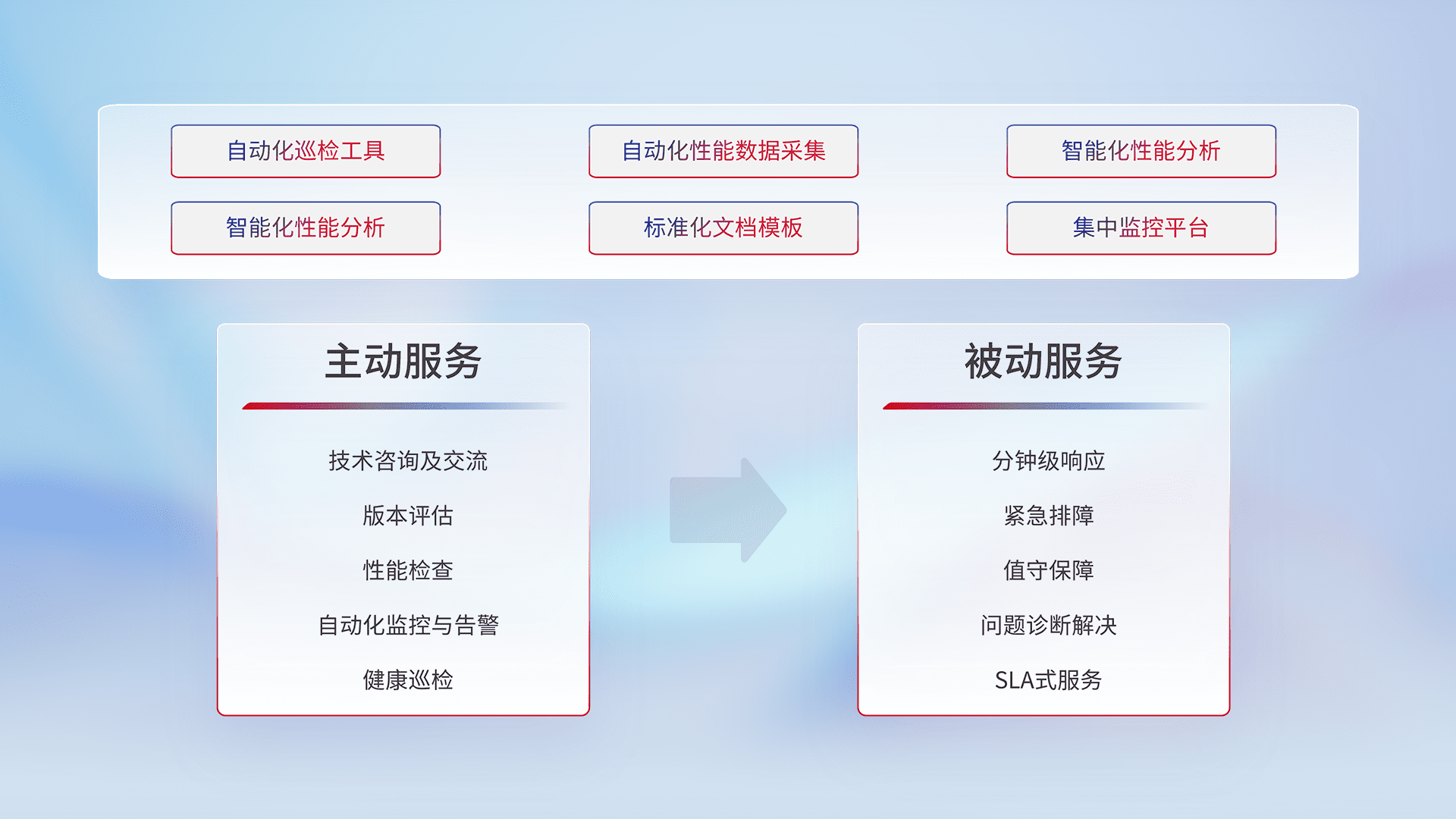 智能化工具和标准化文档,,,保障服务质量,,,提供主动服务(包含技术咨询、、、、版本评估、、性能检查、、自动化监控与告警、、、健康巡检)和被动服务包含(分钟级响应、、、、紧急排障、、、、值守保障、、问题诊断解决、、、SLA服务)。。。。
